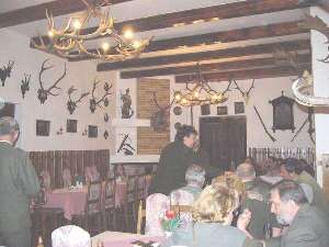 Next day, up early again to head for the Castle Konopiste which is 45km south of Prague where the field trail was being held on the lands near the castle. This was quite a tourist area with restaurants and stalls selling Czech crystal, and a motorcycle museum that was closed for the season. We all gathered at the Stara myslivna restaurant where we had our usual 2nd breakfast, and a game soup that was a bit suspect of the ingredients but hey, when in Rome. The restaurant was very impressive with chandeliers made from deer antlers, roe deer spikes along the walls, pig tusks, Mouflon horns, guns, a crossbow, old hunting prints, a badger hide, mounted polecats and a huge owl. It was interesting that the roe deer spikes that were deformed were especially treasured, whether as oddities or for some special reason I don’t know.