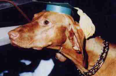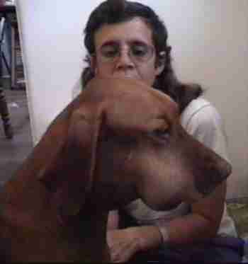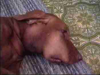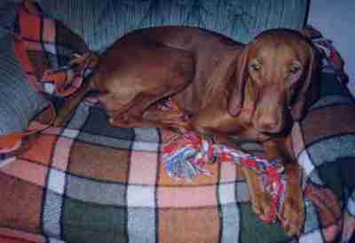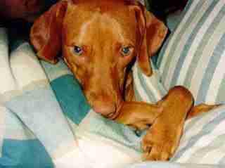 Another photo of Nancy West's Vizsla, Kallmee Heat Wave (Dazzle), DOB 9/12/95; Working Assistance Dog and red velvet princess
